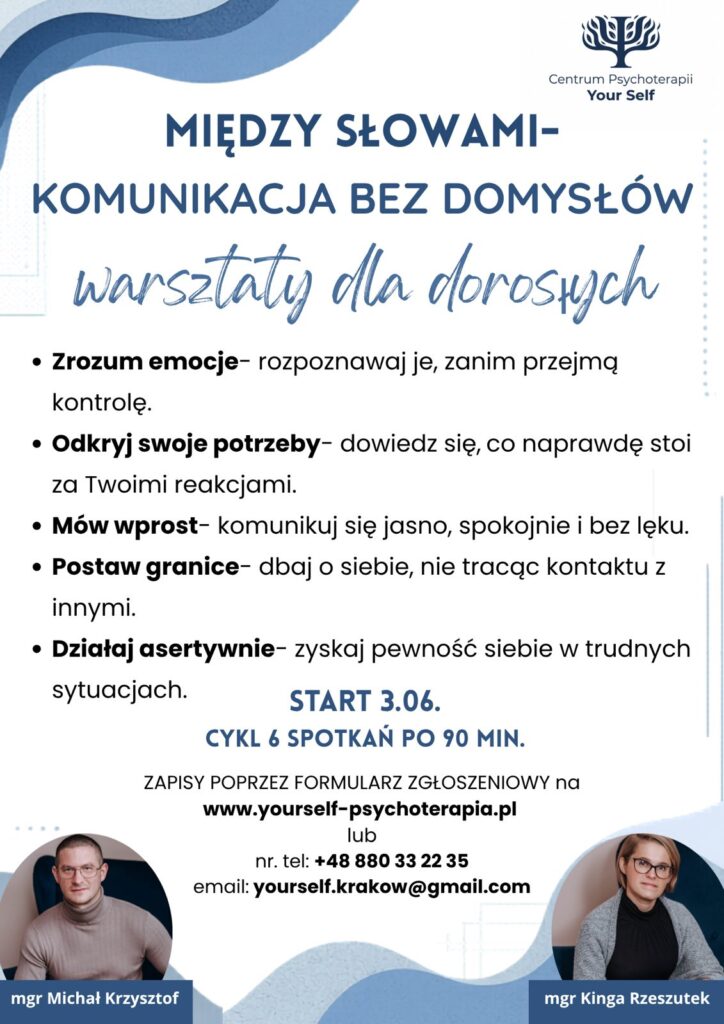 Zapraszamy do wzięcia udziału w organizowanych przez nasze centrum warsztatach psychoedukacyjnych dla dorosłych! Poprowadzą je nasi wykwalifikowani specjaliści: mgr Kinga Rzeszutek – psycholog, psychoterapeutka oraz mgr Michał Krzyszfot – psycholog, psychoterapeuta.